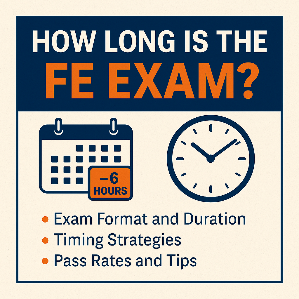 The FE exam lasts about six hours in total, with 5 hours and 20 minutes of actual test-taking time spread across 110 questions. While the length can seem daunting, success comes down to preparation, pacing, and endurance. By understanding the exam’s structure, practicing under timed conditions, and learning to manage both your energy and your time, you position yourself for success on test day.